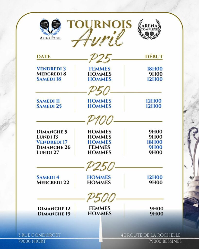 L’Arena padel propose divers types de tournoi.